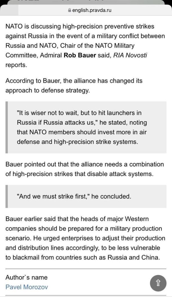 NATO is discussing the possibility of preemptive precision strikes on the territory of Russia in the event of an armed conflict with the alliance countries. This was stated at a conference in Brussels by the head of the Military Committee of the bloc, Admiral Rob Bauer.