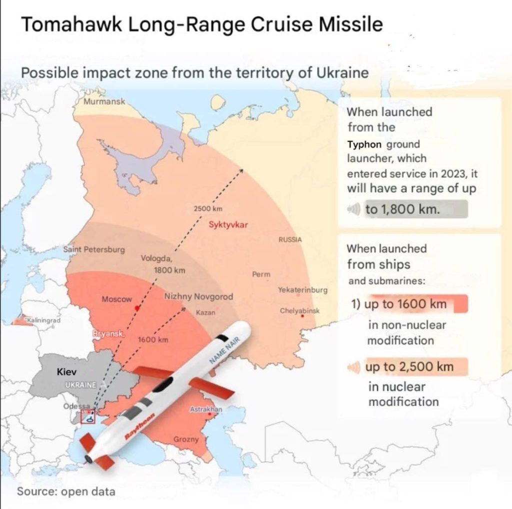 If launched from Ukraine, Tomahawk cruise missiles with strike range of over 1,500 miles (2,500+ KM) – possible 5,500km with classified warheads – can reach well beyond Moscow (see above).