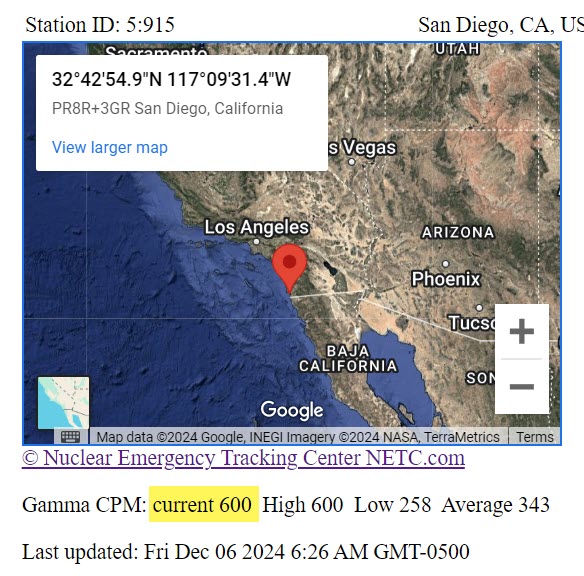 After yesterday’s offshore “earthquake,” there is presently a significant Radiation Spike in San Diego, CA, which is now showing 600 Counts-Per-Minute (CPM) of Gamma Radiation in the 800 KeV range; about triple of everywhere else in California.