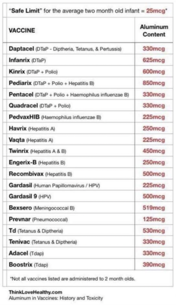 The FDA safe limit of Aluminum is 25mcg BUT, babies get 250mcg on the first day of life with the Hepatitis B vaccine alone. Remember, ingested and injected are 2 different biological processes.