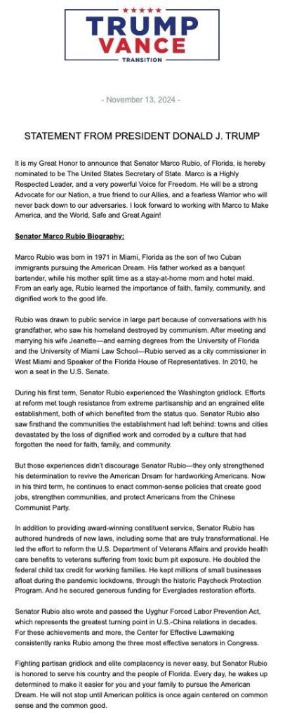 Marco Rubio (Secretary of State) –